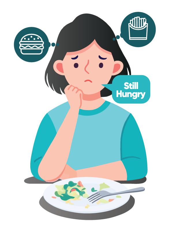 Your stomach may be physically full, but your brain isn’t getting the signal so you still feel hungry and keep eating.